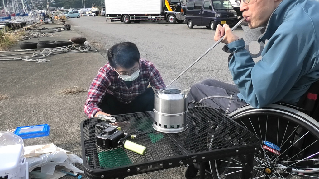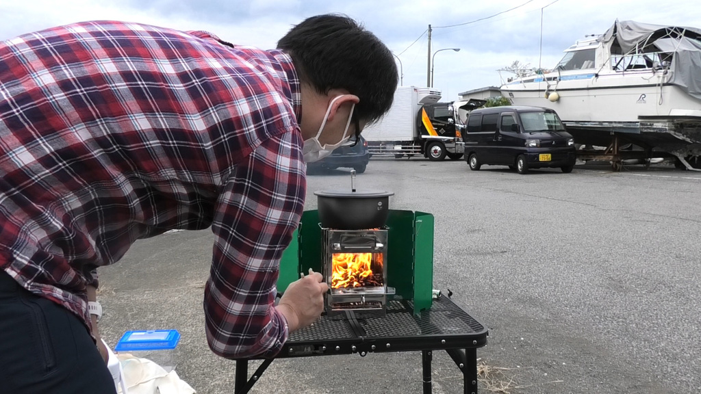 ヤシガラ炭で始めた湯沸かしが沸騰してきた頃