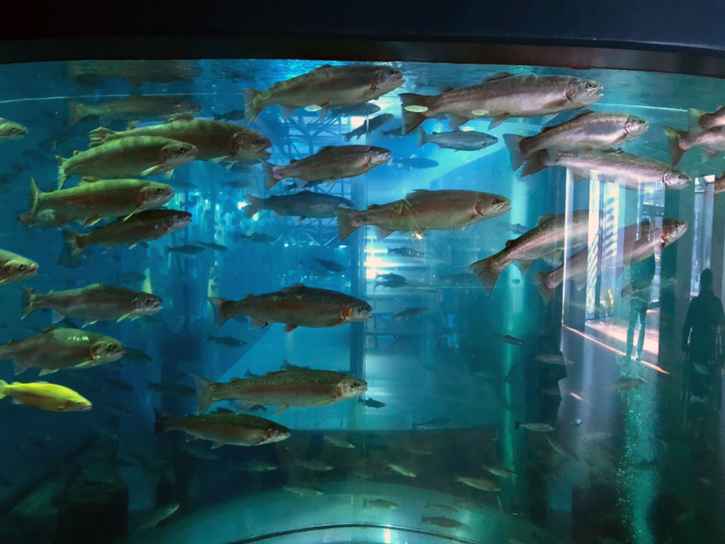 川の流域を演出した水槽や巨大鱒の水槽などがあり