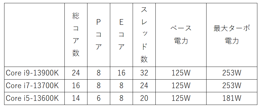 13世代CPUの簡易表