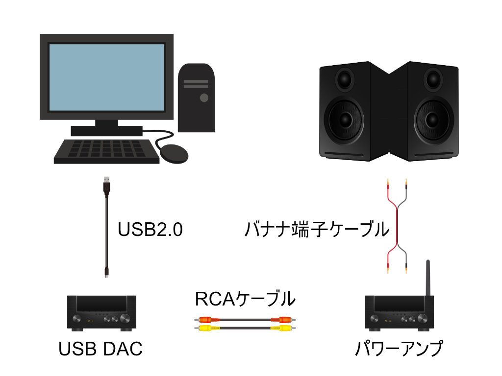 接続のイメージとしては、PC、USB DAC間はUSB接続、USB DAC、パワーアンプ間は